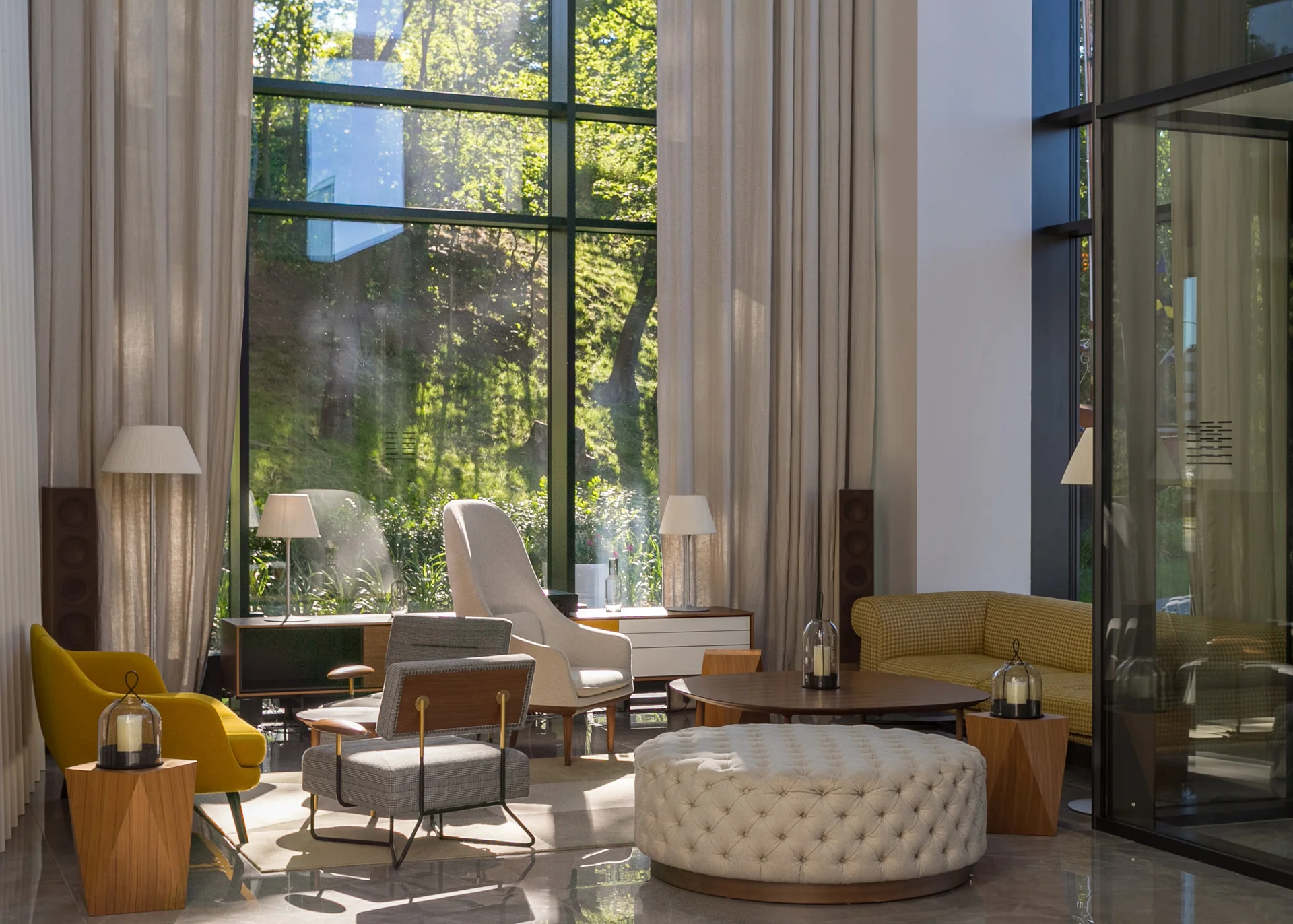 Kopējās hallēs ar griestu augstumu 12 m ir ierīkotas bibliotēkas un tajās ir konsjerža postenis viesu sagaidīšanai.