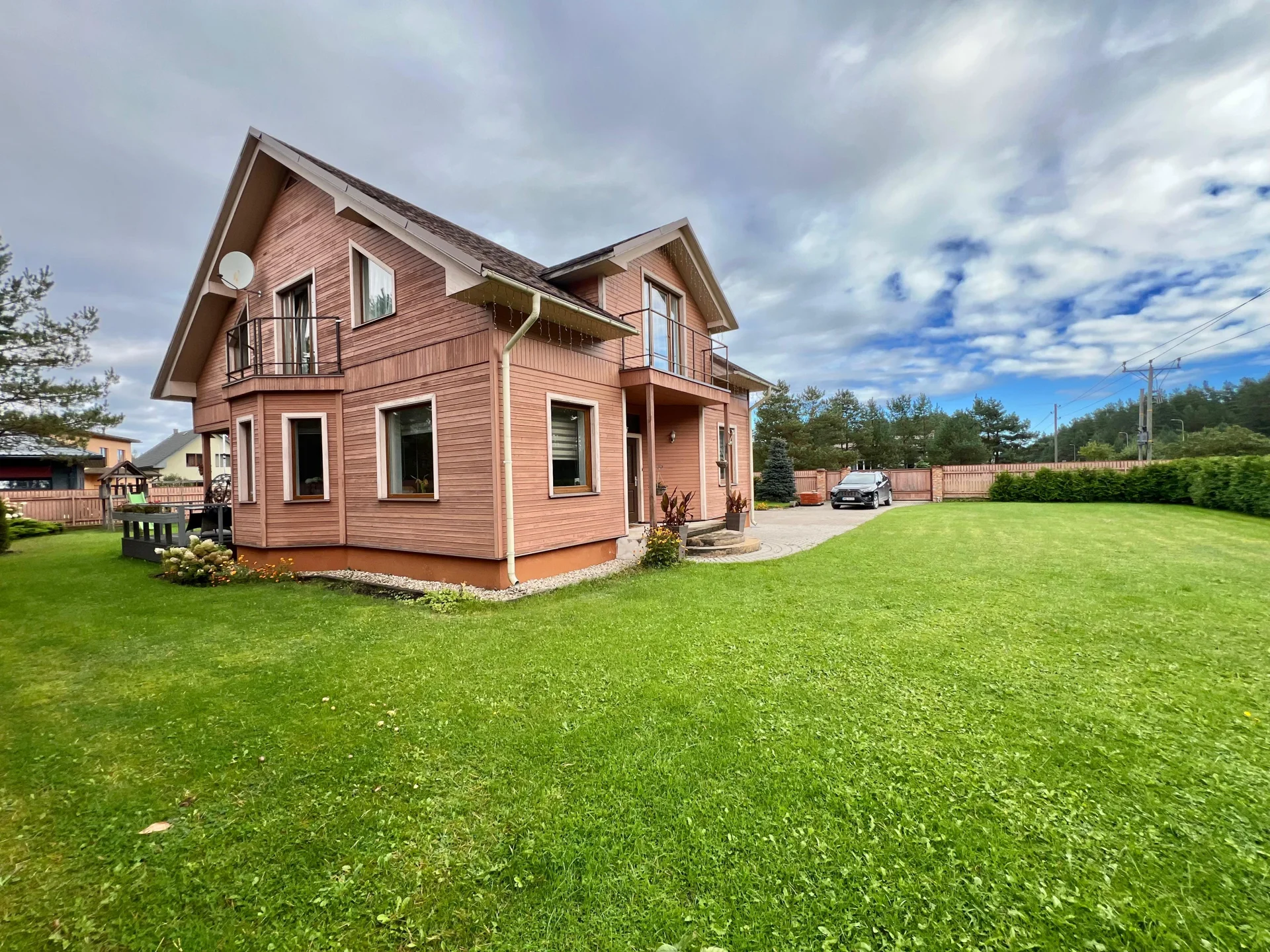 Pagalmā ierīkots bērnu rotaļu laukums, pirts māja ar nojumi, garāža vienai automašīnai, kā arī bruģētas piebrauktuves un zaļš, kopts dārzs. Apkārtne ir klusa, zaļa un droša – lieliska vieta ģimenei, kas novērtē mieru un privātumu, bet vienlaikus vēlas palikt tuvu Rīgai. Līdz pilsētai tikai 15 km, un līdz mājai ved asfaltēts ceļš.