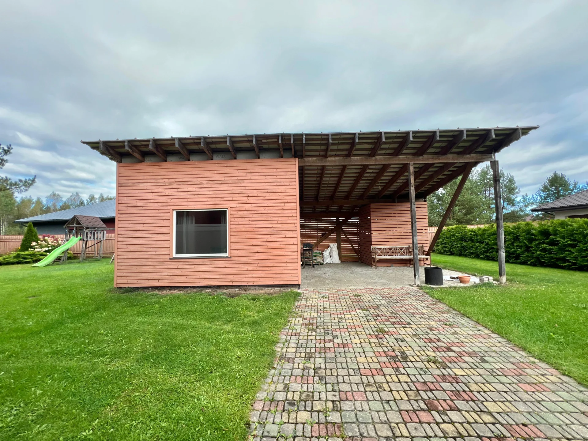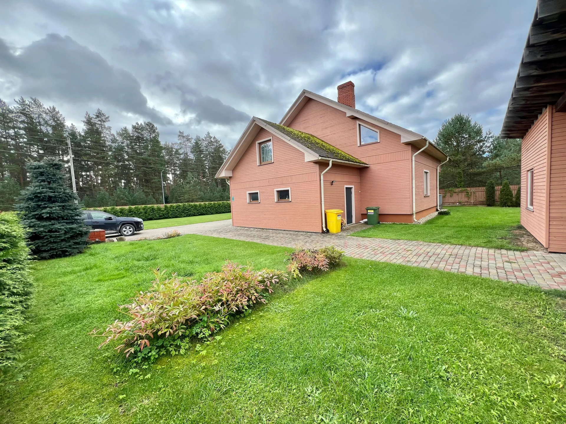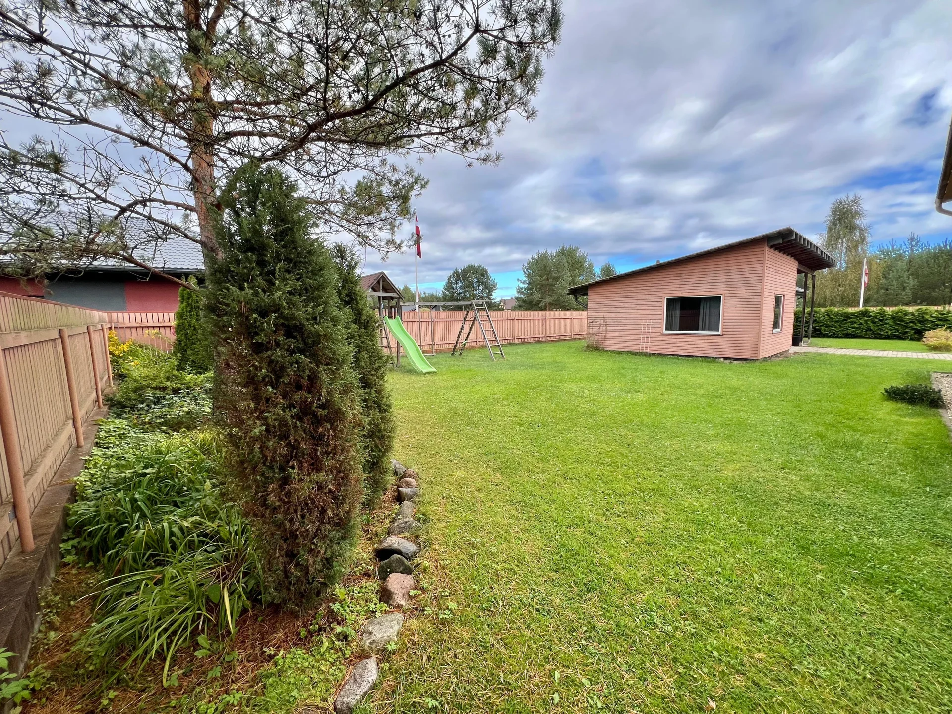 Pagalmā ierīkots bērnu rotaļu laukums, pirts māja ar nojumi, garāža vienai automašīnai, kā arī bruģētas piebrauktuves un zaļš, kopts dārzs. Apkārtne ir klusa, zaļa un droša – lieliska vieta ģimenei, kas novērtē mieru un privātumu, bet vienlaikus vēlas palikt tuvu Rīgai. Līdz pilsētai tikai 15 km, un līdz mājai ved asfaltēts ceļš.